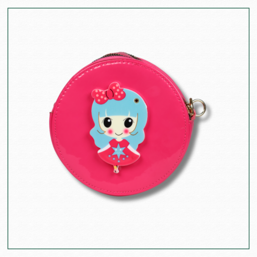 A round purse with a doll and mirror is a fun, imaginative accessory designed for young girls. This purse typically features a circular shape with colourful and playful theme showcasing a cute doll character on the front. The purse include a small functional mirror making it both decorative item and a practical accessory for little ones.