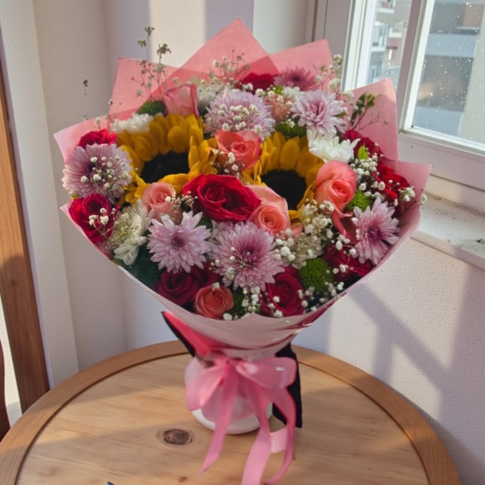 Flower: 2 Sunflowers,14 Local Roses 3 Chrysanthemum,2 Baby Breath