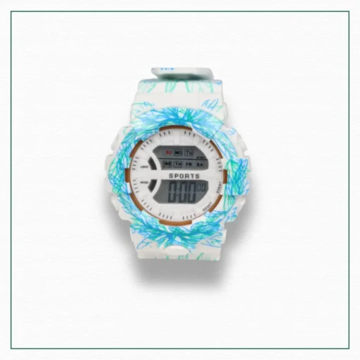 A white and blue digital sports watch with a bold design comes with a tin box. . Key features: . Water resistant. . Night light. . Hourly chime . Daily alarm. . HHour, minute, second. . 1/100 sec chronograph. . 12/24 hour format.
